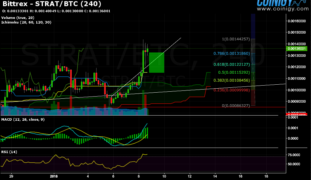 Right now we see Strat making its way towards the top of the kumo around 154k sat. A few bullish indicators lead me to believe strat will moon right through that resistance, however I am still going to set one profit target just beneath incase an exogenous factor prevents strat from breaking through.