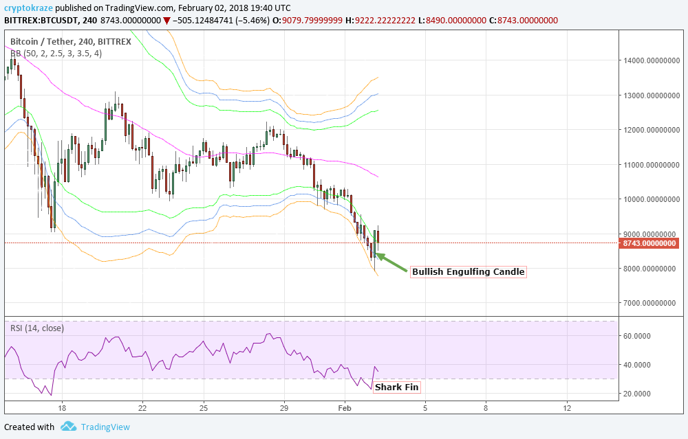 If you look at 4 hour chart, you will see Bitcoin has formed a bullish engulfing candle that is a sign of trend reversal. The next candle has come down to half of that bullish candle and now it will move up because profit taking is done. If we look at RSI then a shark fin pattern has formed as well that is sign of trend reversal. This previous 4 hour candle has shown a good bounce with good volume that was needed to break the downtrend in market.