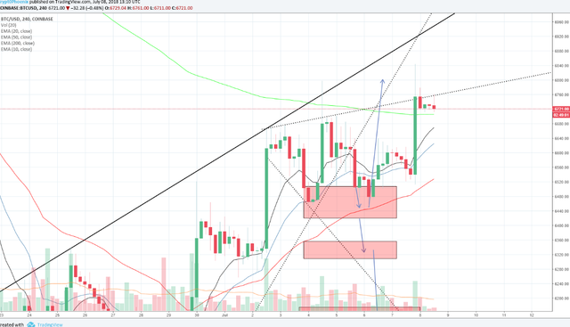 Now, if we look at the chart, BTC has bounced from first 'red' box and currently rose way above it and trading at $6762. If BTC breaks the $6800 with volume, we might expect it to test $7100 then.