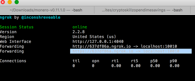 Take the https url https://637df86a.ngrok.io and put it into your web browser and you will see a connection show in the terminal.