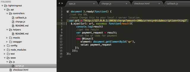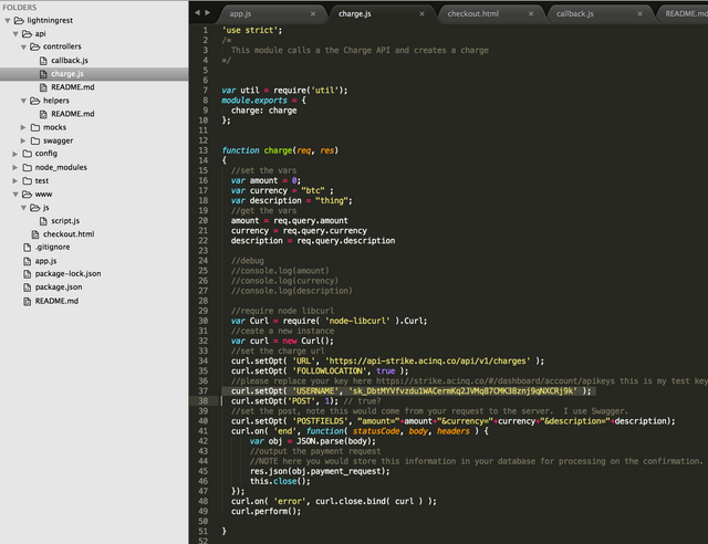 Open the demo application in your IDE of choice (I use sublime) and browse to the file charge.js