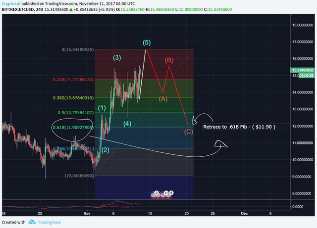 Lastly, Using the Fibonacci Retracement we can assume that the price will land around $11.90 once the 3 wave ABC correction is complete.