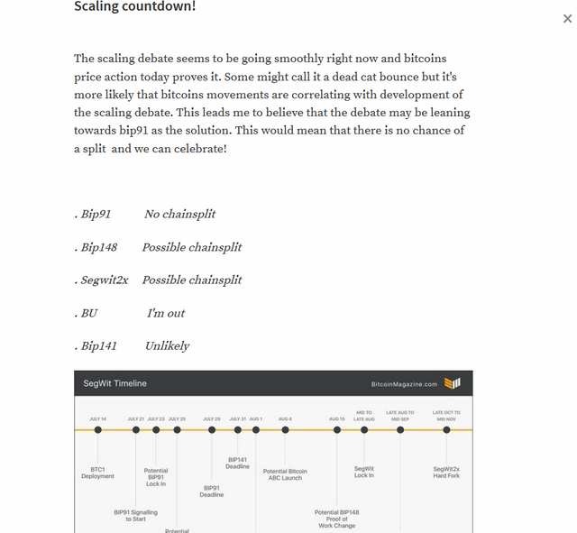 I wrote an article yesterday, explaining that the recent rise in bitcoin is most likely due to the scaling debate leaning towards BIP91. This has now been confirmed, miners are currently signalling almost 80% support for BIP91 and that is all it needs to lock in. This would mean that there would be no hardfork or split from segwit activation. I would also like to note that miners were not expected to start signalling support for BIP91 until July 21 which comes as a surprise to me.