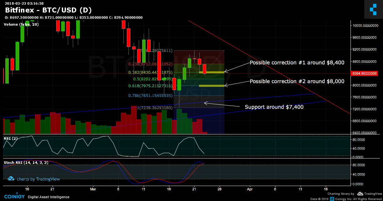 These are the 2 pullback probable price areas I would lookout for the next few days. If bitcoin go even lower than the 62% retracement the next support will be around $7,400. RSI and stoch RSI indicate that this correction will likely to continue probably to the 62% fib level.