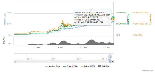 Ripple has recently hit it's All Time High (ATH) of 0.00024 BTC or, at that time, $0.435 in mere weeks of it All Time Low (ATL) of 0.00000452BTC or $0.0054. Currently XRP sits at 0.000138BTC and is seen by many cryptocurrency traders at a great entry point but others feel that XRP is a bubble and is bound to bust very soon.