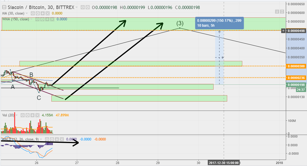 Como se pude ver en la imagen ya esta rompiendo el canal bajista, debido a la formación de un ABC si se cumple hablando de una operación de swing trading podría darnos hasta un 150% de Ganancia, Por el contrario si sigue bajando buscaríamos comprar en la zona de los 120-130 satoshis por unidad. Si llega a bajar a esa zona buscaríamos un patrón ABCDE o mejor dicho WXYXZ.