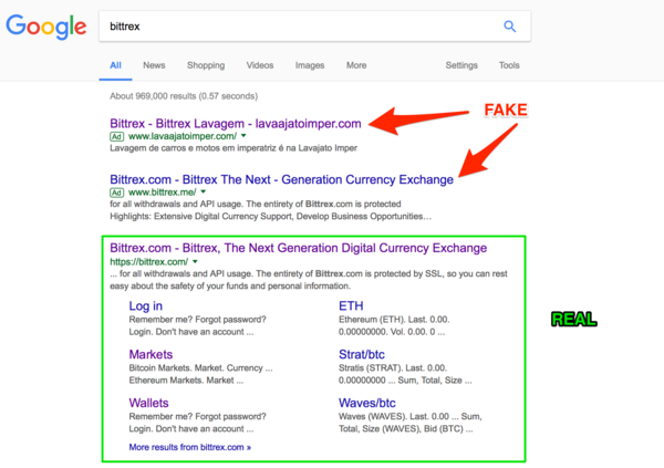 There are phishing websites that promote their fake website on google so when you make a type mistake they come up first. For instance, Bittrex has phishing websites called BIttrex (with L instead of i) or with only 1 t. So bookmark the exchange you are using and check the URL closely before logging in.