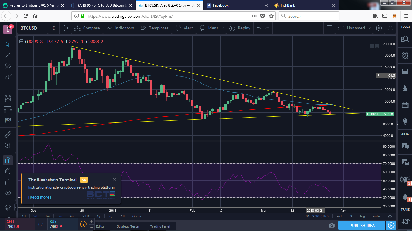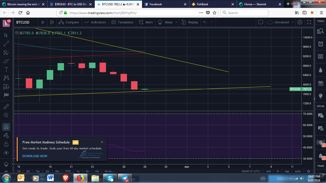 15 days ago I posted this wedge and we are still in it yet we are nearing the end. Usually a descending wedge ends with a positive Bull Run, I have been right this far and it looks to me that we are days before we see explosive positive movement!