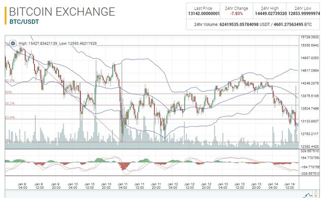 Same as previous post mentions, and BTC has narrowing range as down break in bollinger band band and range of $16840 -$12500 exist till it will not break upward $14600 and down side braked 12500.