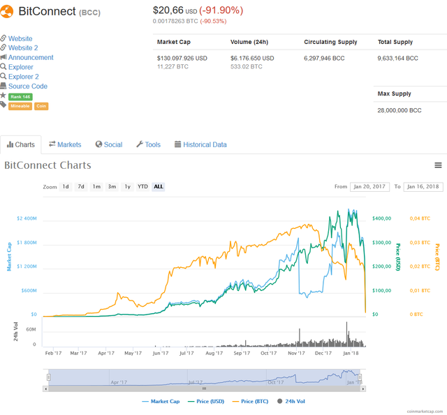 I will try to follow the course of events as they unfold but one can only hope that a 92% decline of market price over 24 hours (at the time of writing) represents the market's subsequent acknowledgement of Bitconnects fraudulent business scheme and the final failure of its deceptive marketing mechanisms.