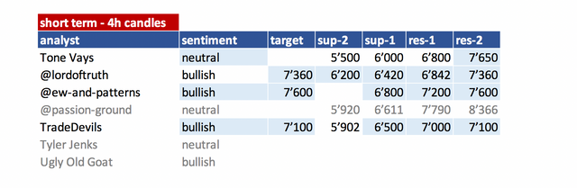 - sentiment = how in general the analysts see the current situation (bearish = lower prices more likely / bullish = higher prices more likely). The sentiment is based on 4hr, daily, weekly, monthly candle charts.