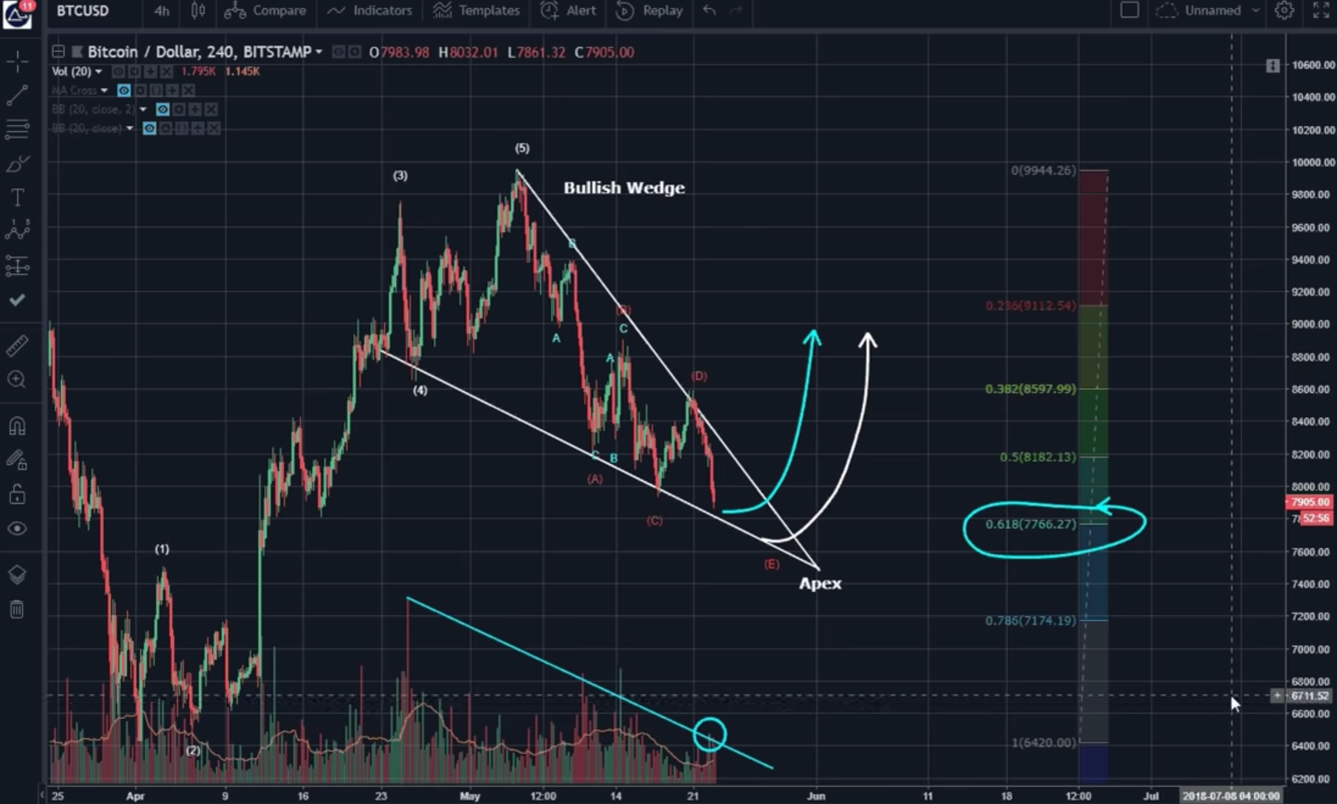 Expects us to go down in a Bullish Wedge - the current move is well in the boundaries of this bullish wedge. It will be invalidated if we breach 7'766 significantly. Volume is declining - that is a good sign. From there he is expecting a breakout.