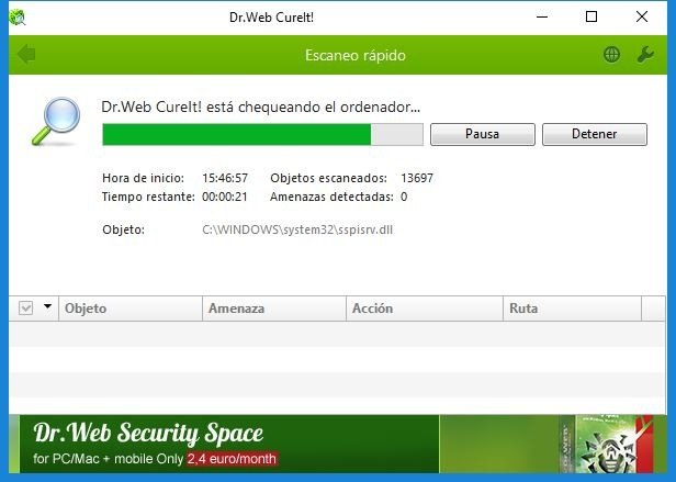 If the program for which we have decided is Dr. Web Cureit !, just press the Scan button so that the program starts looking for threats on the PC. If you find them you will give us the option to clean.
