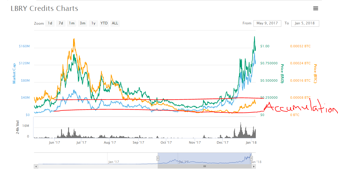 The reason I'm watching Ethereum right now is because of the chart I have above showing Library Credits, but these are the coins I'm looking to buy. Coins that are starting to show strength, but have not yet rocketed to the moon. Coins that are still in the accumulation phase (ones that have yet to break long-term resistance from all-time lows). Before I buy any LBRY Credits, however, I'm going to see if they have any upcoming announcements or upgrades coming 1st half 2018 to help increase its strength.