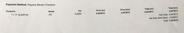 As you can see, I got a bargain of a 1g bar at 5.837btc with a very reasonably priced 1.5 btc for postage.