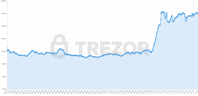 Due to the high number of bitcoin transactions exchanges send, often simultaneously, batching has the potential to provide even greater cost reductions than Segwit. It’s difficult to determine the percentage of transactions that are batched going by available blockchain data. It can be deduced, however, that their adoption is on the rise. Coinmetrics points out that around $10 billion of BTC a day is currently being sent, the same amount as November of last year. The difference is that back then it took 300,000 transactions per day to reach that figure, versus 180,000 now. At 60% of November’s transaction volume, it’s likely that batching is playing an increased role.