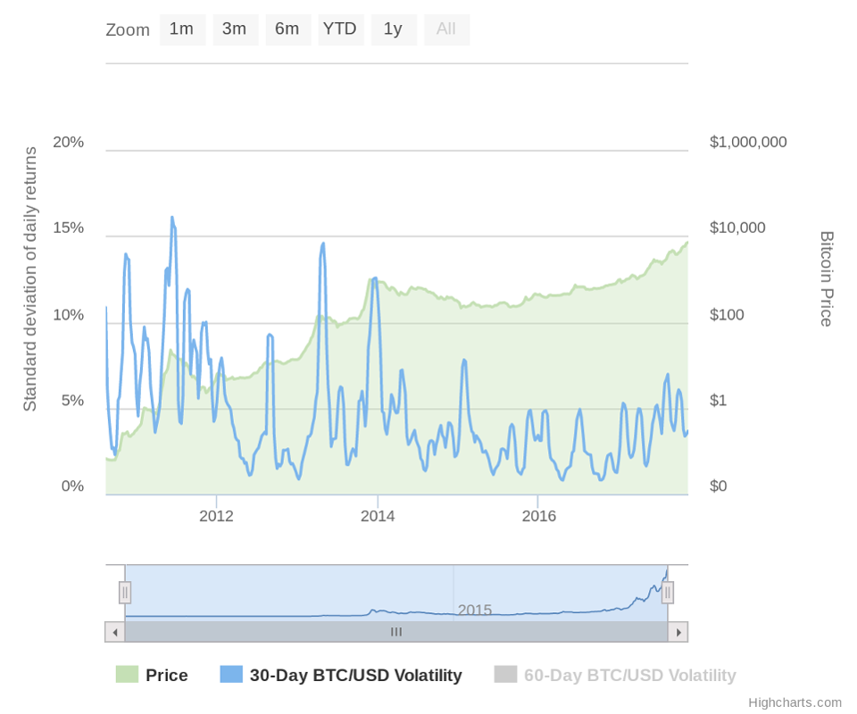 As the chart above indicates, bitcoin’s price volatility has tended to decline as more money has entered the market and the price has gone up. As liquidity rises, it takes more money to push the price around with a single trade.