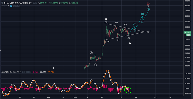 Cryptos love triangle patterns. It's to me the truer reflection of sentiment than equities which is prodded, pushed and stretched by the PPT and Central Banks. The chart below shows an A,B,C,D,E triangle (3,3,3,3,3) waves nearly complete. If so, an impulse set of waves should brig price to $6,200 or so. The MACD in thsi hourly chart is curling upwards to support.