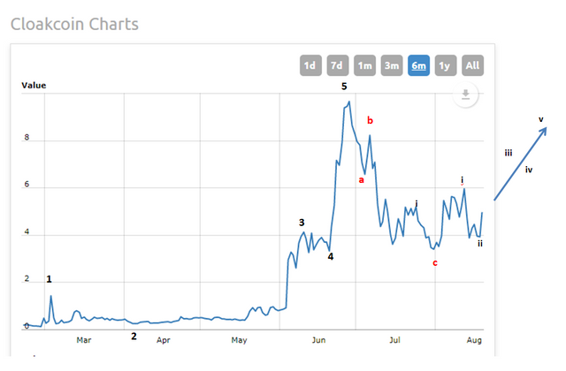 CLOAK is not hiding any of its price actions! With abc (red) complete, wave i, ii are placed and iii,iv and v are coming up.