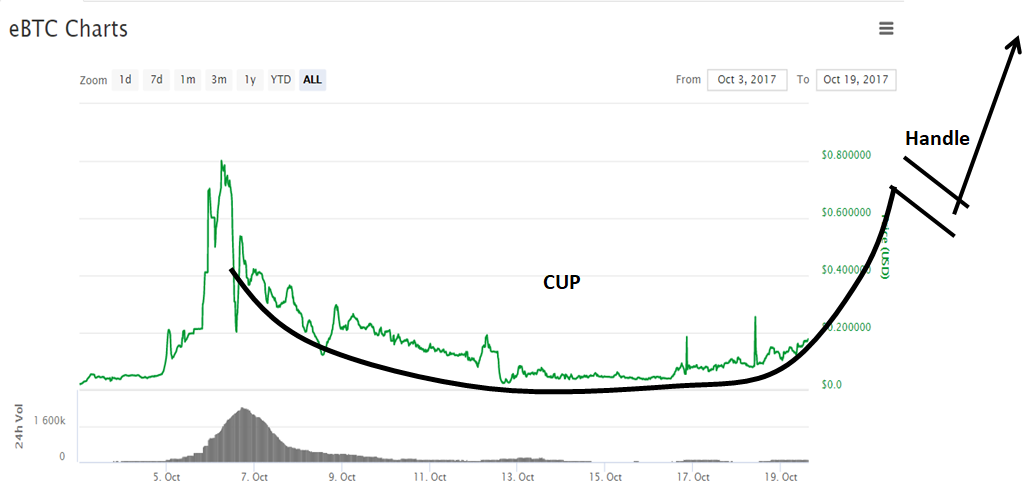 Many analysts out there just hate eBTC saying it's trash, has no value and a scam. I couldn't care less because my Technical Analysis shows that sentiment drives prices. To this end, eBTC seems to be putting in a rounding bottom pattern and is more than 2/3 complete. This means that the the remaining 1/3 could be involved in price rising to as high as $0.60. From there, forward discernment says that a handle pattern could be put in to generate a cup & handle bullish pattern.