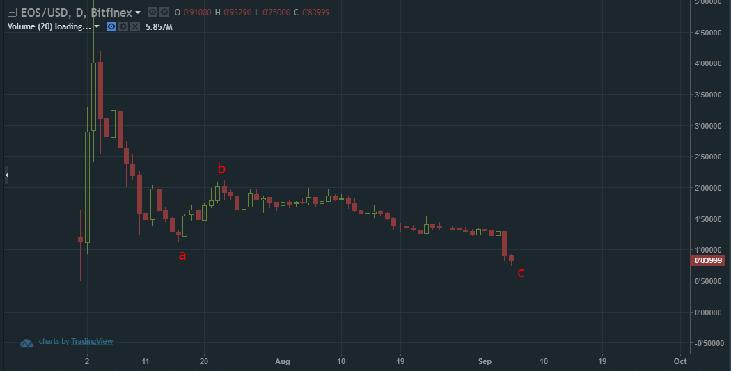 How far exactly the c wave will go down depends much on the Bitcoin Bear which just started its correction. So, for now, I've labeled the c wave just above the all time low point but would not be surprised if it fell through that level with Bitcoin downdraft.