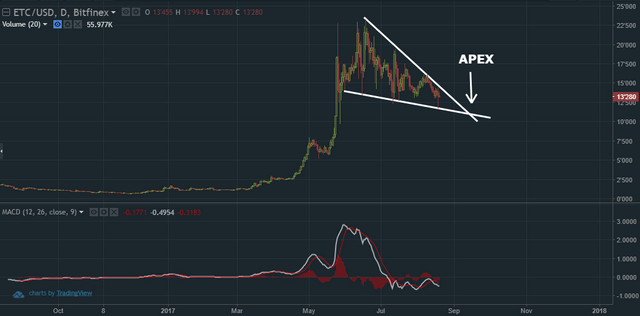The closer the price gets to the apex point which is where the upper and white trend lines cross, the more restless ETC gets because the degree of agitationt ot break out of its bonds becomes uncontainable.