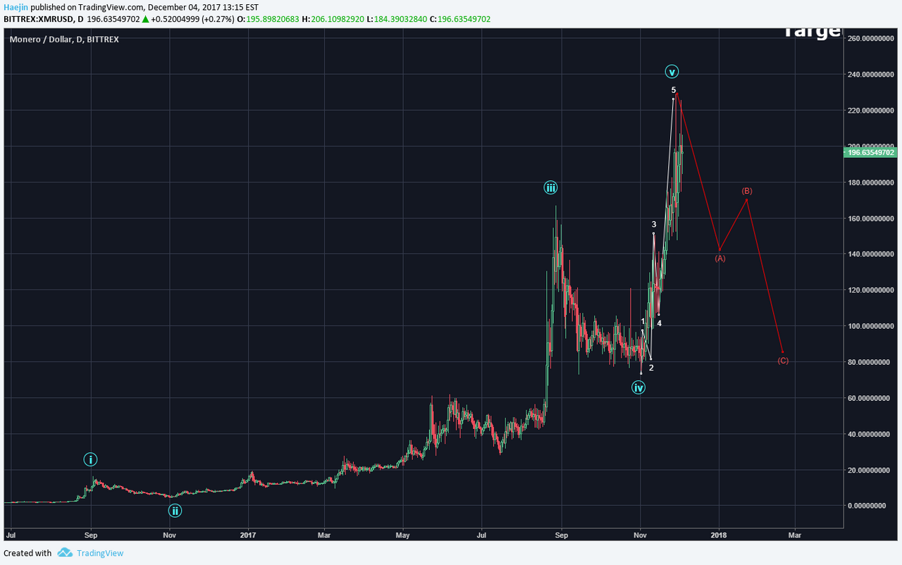 Monero (XMR) has had a beautiful run up! However, Elliott Waves states that after five waves, there is a requisite a,b,c retracement! To that end, the below chart shows how the a,b,c correction price pathway might look. Usually, the c wave retraces as low as the prior wave 4 and that at around $85. So, now is NOT the time to be BUYING Monero but rather it's time to be taking Profit SELL actions. Ladder out and take your profits gratefully and humbly, without a hint of greed! I often ladder out 30% to 50% of position and use the proceeds to ladder back in at the terminal end of the a,b,c correction. The remaining 70% to 50% of position allows me to still gain should prices continue up for a while.