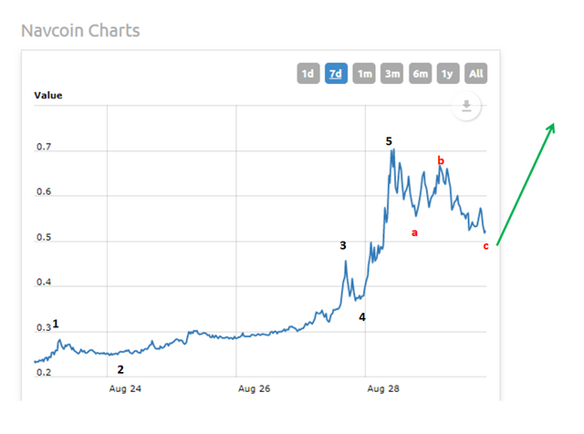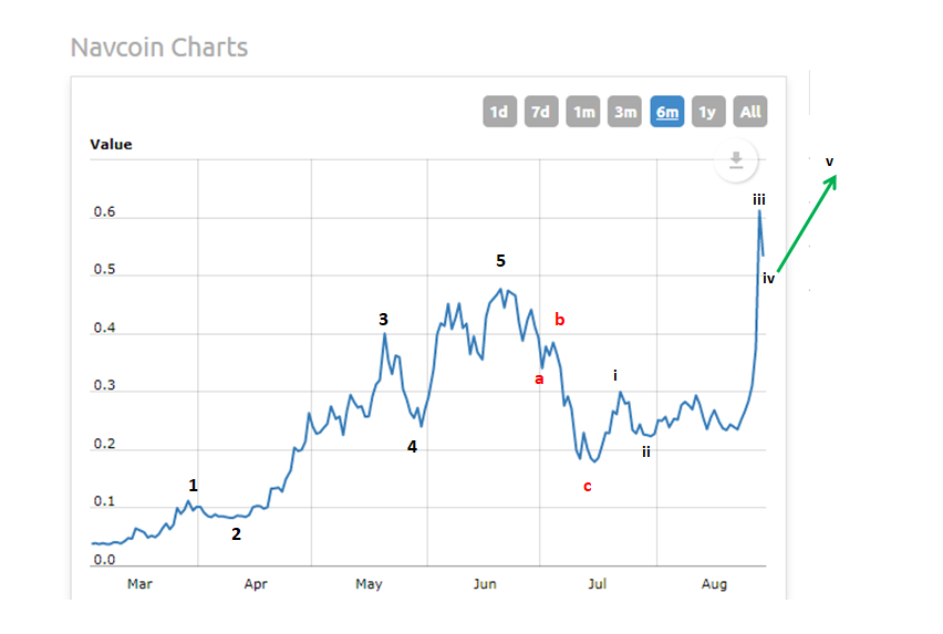 Here is the daily chart for NAV and labeled with waves. It is finishing wave iii and so a small correction of wave iv is expected and then the terminal wave v. This wave could become extended, as is common for cryptos.