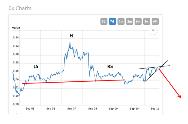 Here is a chart of ZRX with a porminent Head & Shoulders Bearish Top pattern. The Left Shoulder (LS), Head (H) and Right Shoulder (RS) are very symmetrical. The Neck Line (red horizontal was pierced but prices came but above it. Given the rising wedge pattern as outlined by the black trend lines, ZRX will likely succumb to the H&S Top Bearish pattern and so will have lower lows as being probable.
