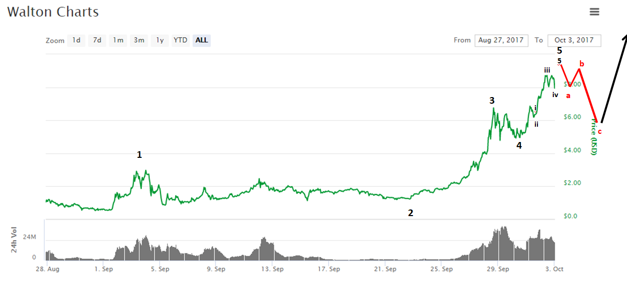 Walton (WTC) is working to place the final wave 5 (black) if not yet already. The subwaves of wave 5 (i,ii,iii,iv,v) indicate that a top is at hand. Once the top is in, the requisite a,b,c, (red) correction will retrace most likely towards the wave 4 price zone. The retrace could end around $6 to $5.50 or so.