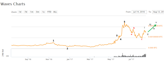 This analysis is per request. Waves/BTC has initiated an impulse waves upward. Not certain if new ATH will be attained...let's see what happens and how extended wave iii might get as it often does.