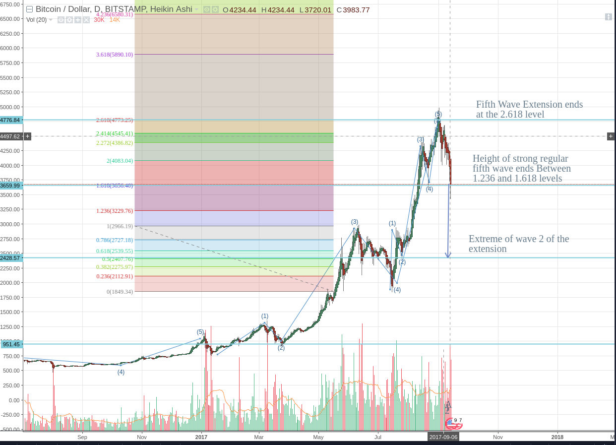 Scenario (4) The market sentiment dictates price action and price action indicates the current sentiment, and that is fear. A shiton of it. In the state of panic the first wave appeared to have occured. Using it we will assume the estimate is strong enough such that 2.618 extension can be used for both waves 3 and 5. it is possible to use the 4.236 but thats fked