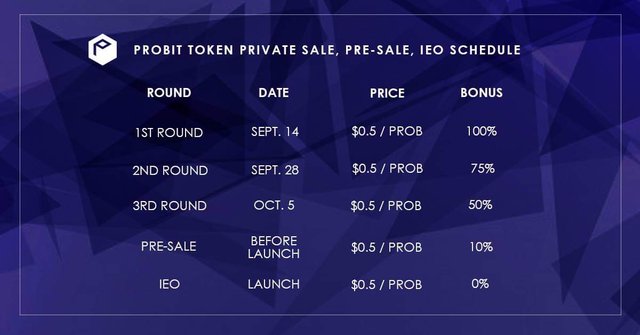 The utility token which will be used to pay for fees on the ProBit exchange will be PROB, an ERC-20 standard token. ProBit will issue 200,000,000 PROB, never to increase. PROB can be acquired at the issuance of the tokens or at ProBit exchange. Trading fee, listing fee and all other fees for ProBit Exchange will be paid in PROB.