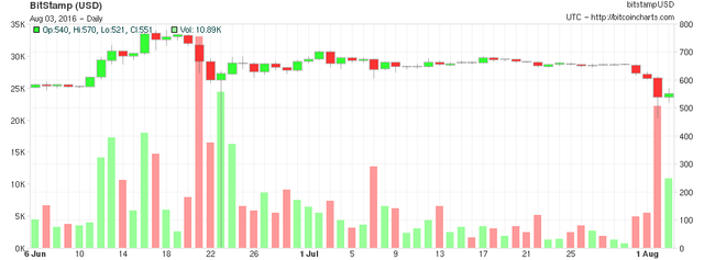 Bitcoin prices have fell from the high $658 that Bitcoin reached on Saturday to it's current price of $552. The price had started falling gradually over the last few days. It was at $605 yesterday when I last checked. I wondered why it was falling but I figured that it was just people dumping and nothing more. Flash forward to today, Bitcoin price is $552. Seriously. Turns out that the Hong-Kong-based Bitcoin exchange Bitfinex was hacked.