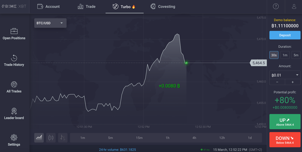 Trading with PrimeXBT Turbo allows for profits of 90% within 30 seconds for any contracts that correctly predict the direction an asset moves within that period.