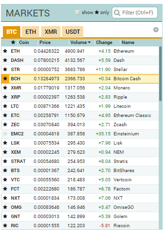 As I learnt more about the various exchanges, chatting to guys in Slack groups, it is clear that your safest bet is to trade where the largest volumes are. If we look at the image below, we can see that the column indicating the volume, and ETH, DASH, STR and BCH are clearly the highest volume trades in the past 24 hours. The volume is important to ensure that there is liquidity and a lot of traders buying and selling the specific crypto coin. This means that there is usually good fluctuation in the price, which means you can easily make between 3-7% on a trade.