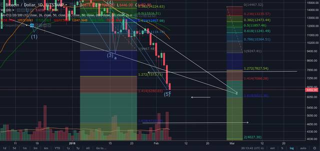 Back to the big picture. I have moved the projection for Wave 5's ending. This can of course end anywhere, but if it's going to go further past the 1.272 of Wave 3, then we have a few likely landing zones. The first one is relatively near at about $6009, this would be the likely 1.618 Fib Extension of Sub-Wave A of the Fifth Wave. For those who need clarification, Elliot Waves comprise many different counts and forms. We're seeing a five wave triangle elliott wave formation right now, with each wave being composed of a set of subwaves. The impulse waves (or waves to the upside) are composed of five waves, while corrective waves (waves to the downside) are typically composed of three. In this chart I've plotted the three sub-waves of Wave 5, which is the last wave of a five way corrective cycle. By measuring the length of Subwave A, we can guess a likely length of Subwave C, which should be the last subwave of the last wave of the corrective cycle. A recovery should come after. So the 1.618 Fib Extension of Subwave A would bring us to $6000. However, if we're measuring not from the sub-waves but from the main waves (meaning we'd have a very extended Subwave C) then the next Fib Extension for Wave 3 would be the 1.618 at $4700. I do not expect this steep of a decline, just telling what the chart shows.
