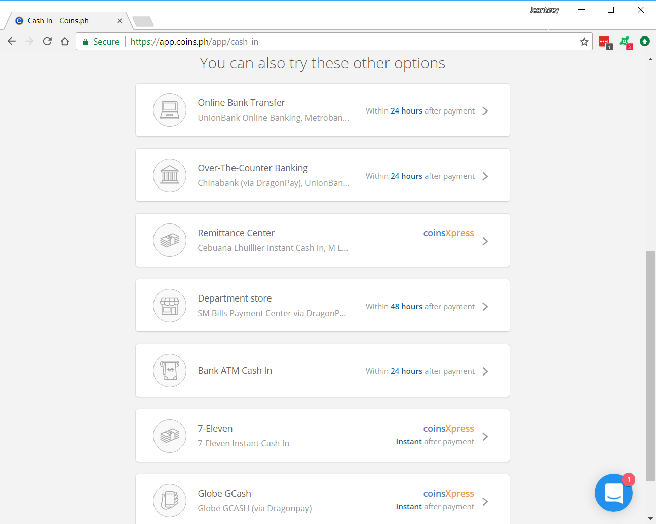 Click CASH IN to view all the options on where you can top up your Coins.ph account.