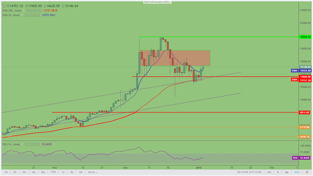 At last, its cleared that Bitcoin is still in downtrend and recent upmoves are just a wave on upside in downtrend or correction. Trader should grab the opportunity to short Bitcoin at resistance zone and buy at support of 50 days ema. Investors should really wait for clear breakout over resistance zone because if support gets violated than Bitcoin can drop till 8k mark, so its really not wise to jump before gun.