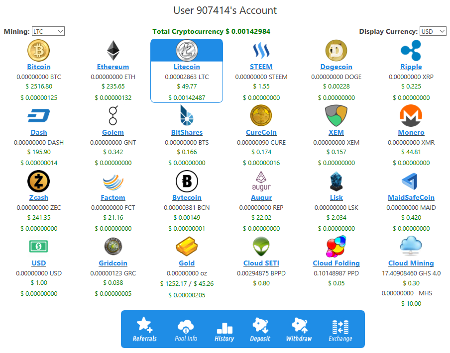 This is what the interface looks like in case you have not seen it. As you build up coins you can choose to let the coins accumulate or you can reinvest your earnings with the exchange tab. Your earnings will accumulate very slowly at first and increase over time as you reinvest your earnings into more GH/s. There is always of course the paid option. It seems to be a long term investment because they say your investment will take 15 months to get your initial investment back. You can choose to mine any of the coins you see above also. Bitcoin, Litecoin and Dogecoin even. With the strangest option being gold by the ounce. I have made deposits and withdraws to check that out and both worked. Although a little slow.
