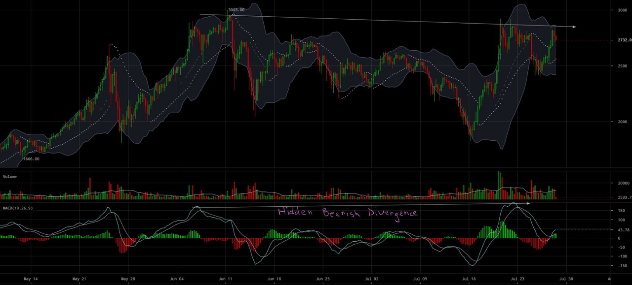 Looking at the 6HR candles trend, there is a subtle hint of macro bearish divergence on the MACD. When the MACD signal line/moving average makes a new high, but the price trend does not make a new high, this can be an indication of bearish leaning momentum called “hidden bearish divergence.” In addition to the MACD hidden bearish divergence, we can see a severely decreased volume trend as we approach the highs made a couple weeks ago. In general, the upper $2000s seem to be a battleground that is starting fizzle out in a bearish fashion. This could be attributed to many factors, but ultimately I think the wild price swings can be easily explained by the great uncertainty in the market surrounding the August 1st hardfork.