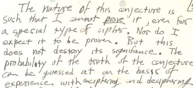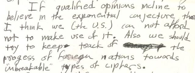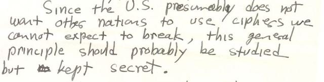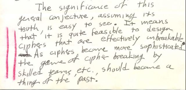 He continues to gloss over the validity of it, which I think is probably standard among “geniuses”. Having no time to convince people, he wants to go on to the ramifications of such a conjecture actually holding. It's interesting that he writes to the governments and says “we” but also qualifies the pronoun with “(the US)”. It seems there is some paranoia here he is dealing with, or in other words, he wants to make sure the reader knows he is patriotic to his nation. The last line is significant and will come into play at the end of this article, “....we should try to keep track of the progress of foreign nations towards 'unbreakable' types of ciphers. Here Nash is explicate in what he proposes, the existence and evolution towards unbreakable ciphers as well as the implication of them.