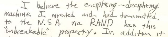 I have read that, in today's crypto-science, Nash's proposed design is not actually as secure as he states here. I'm still unsure if that is true, or if those that claim this don't fully understand his proposal. Nonetheless it is quite the claim, and at this point it seems clear Nash felt he had a lot on his shoulders with this insight. Furthermore, as I understand his conjecture and its implications, whether his machine's encryption is unbreakable or not is not important, and I kind of suspect Nash would have felt this way as well.