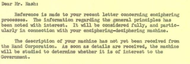 I'm not exactly sure the truth of this, but at least as a conspiracy theory it is interesting to note that the receivers of Nash's letters were somewhat forced to reply and reveal their interest since they couldn't seem to find the designs he said he sent to the other agencies. We know this result is favorable to Nash because he stated “it would be nice to have some sort of answer.”