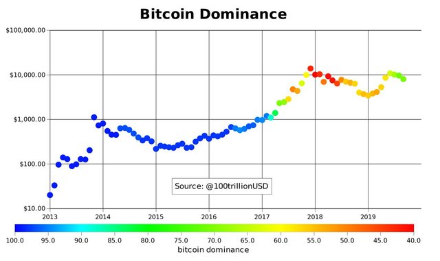 Bitcoin's dominance went from 98% to 40%, and now back to 70%: