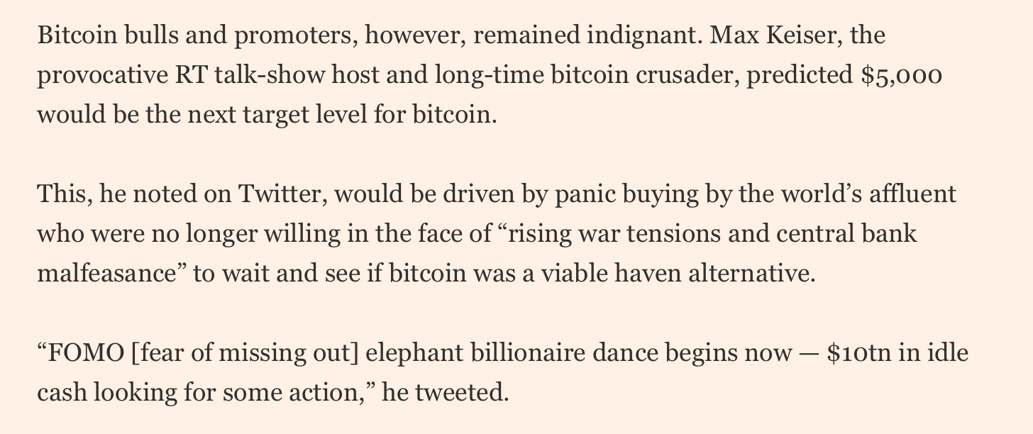 Full disclosure, many years ago, Max and the journalist, Izabella Kaminska, on this FT piece did get into a bit of a Twitter flamewar which had spilled out from a pub debate they had in central London about bitcoin. This was back when it was under $100 and Izabella was, if I recall correctly, claiming bitcoin couldn't work and that there were too many bitcoin fundamentalists out there. I forget the exact nature of the argument but it's somewhere in the Twitter archives, I should think. She's been one of the earliest financial journalists, however, covering bitcoin since the very early days and I like her a lot. Well worth the read.