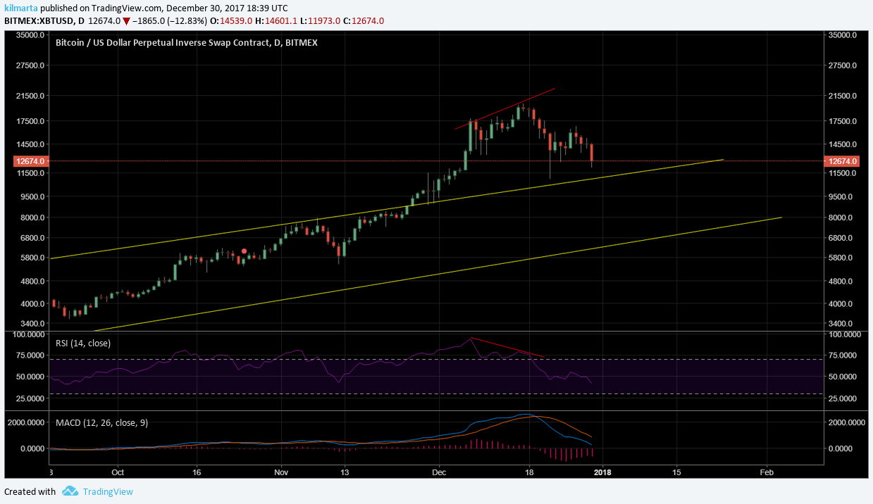 The aforementioned long term trend line, currently at around 11k which is also the recent low, needs to hold or we could see a retest of the bottom part of the trend (bottom yellow line). This edge to edge fall would likely take weeks and could put us somewhere in the 7k region.