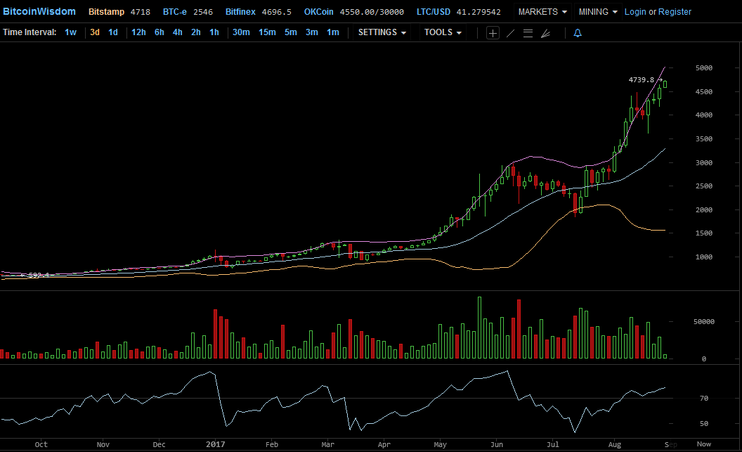 I expect this bitcoin bull market to top out at $7000 maximum but the top might be lower. RSI indicator on a three day chart can guide you on timing to take profits. Check RSI on the three day Bitstamp chart: