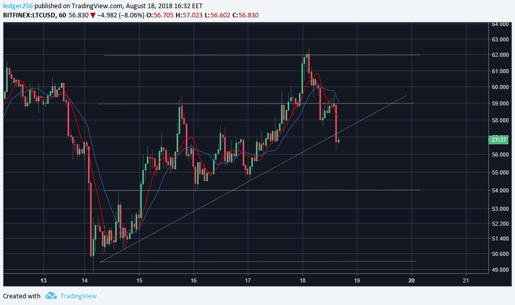 As we mentioned, LTC was behaving in a slightly different way to its siblings, in that over the past week it has not established one clear resistance level that it has failed to break. Over the past few days, it has formed a dynamic uptrend, yet it has managed to break above $58 and close above it on the hourly chart. We had potentially established $58 as the resistance level to watch, but $59 would have been more accurate to be honest.