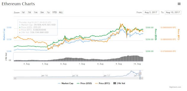 The price of cryptic currency is strongly dependent on the price of the first and largest currency of this type: Bitcoin . By the increase after the avoided Soft Fork and the Hard Fork, which Bitcoin Cash would have but hardly had any impact, also developed Altcoins such as Ethereum positive.